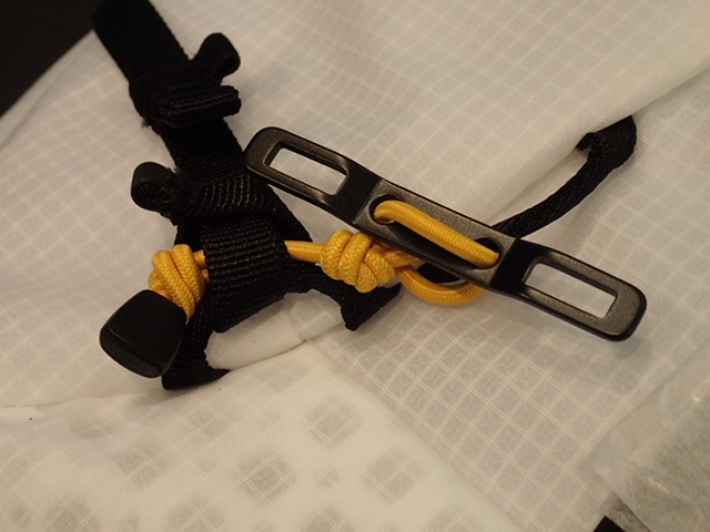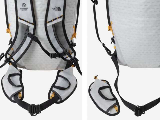 55Lと40Lはヒップハーネスは2段階(本体側の黄色ループへ引っかけ)で高さ調整が可能となり、クライミングハーネス着用時に干渉を軽減してヒップハーネスを使用することができます。