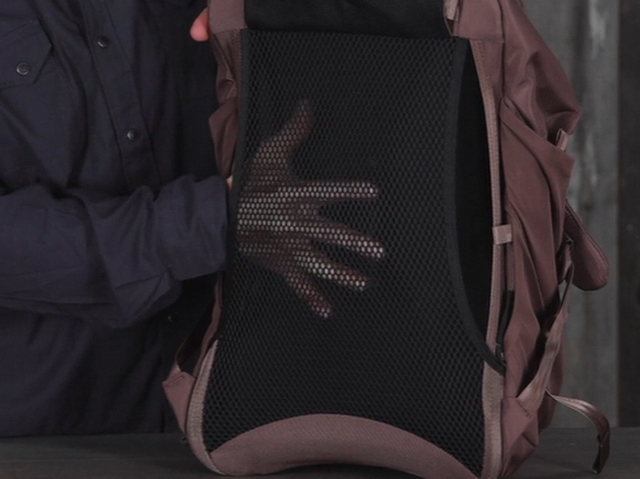 背面構造は背中とバッグの間に空間が保てて快適な吊り下げ式、エアスピードバックパネル。